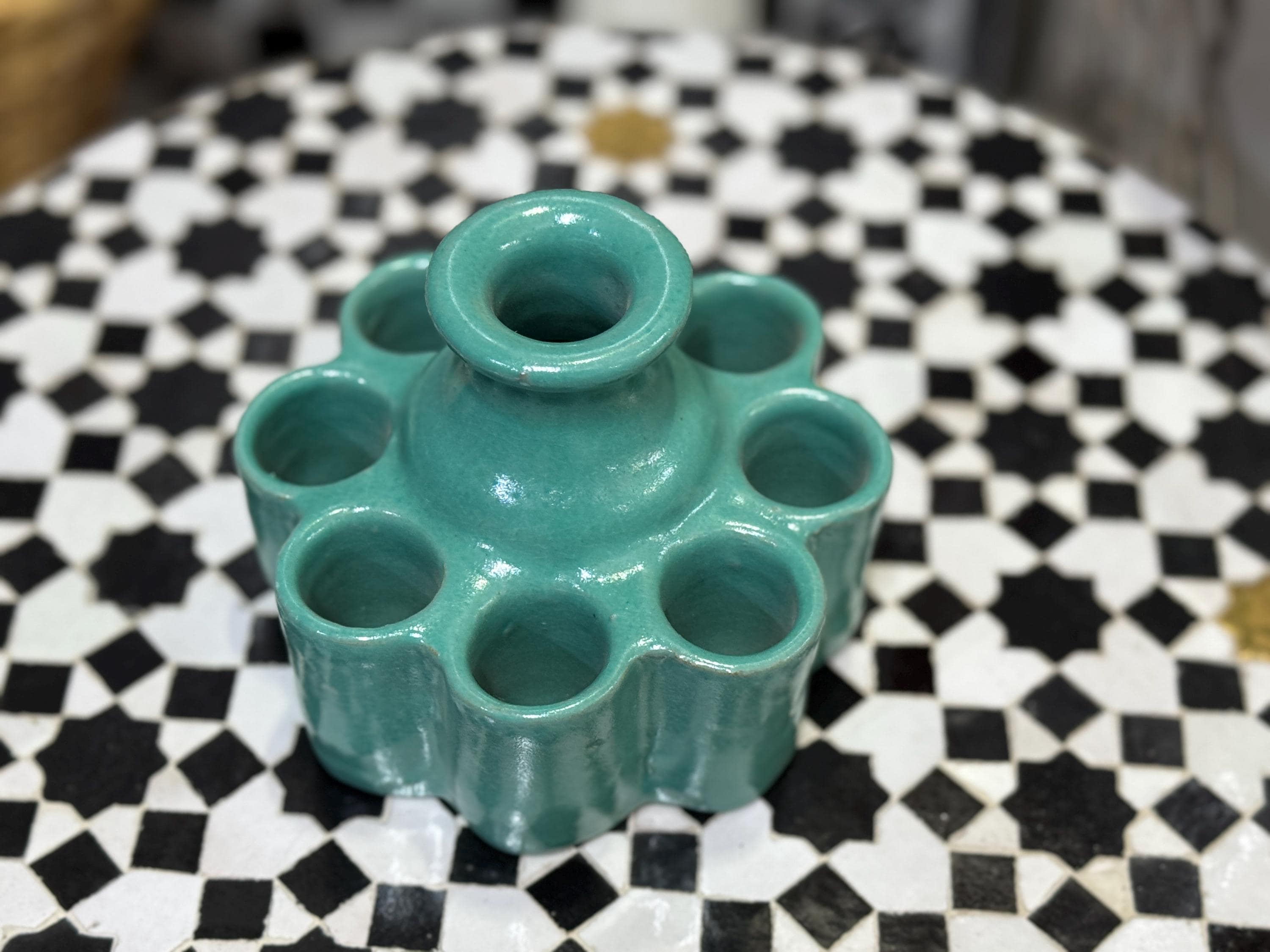 Bring a touch of tradition and elegance to your workspace or decor with this handmade authentic Moroccan green ceramic inkwell. Skillfully crafted by Moroccan artisans, this unique piece reflects the rich heritage of Moroccan pottery. Its vibrant green glaze, intricate detailing, and vintage-inspired design make it a perfect addition to your desk or a thoughtful gift for lovers of handmade decor.